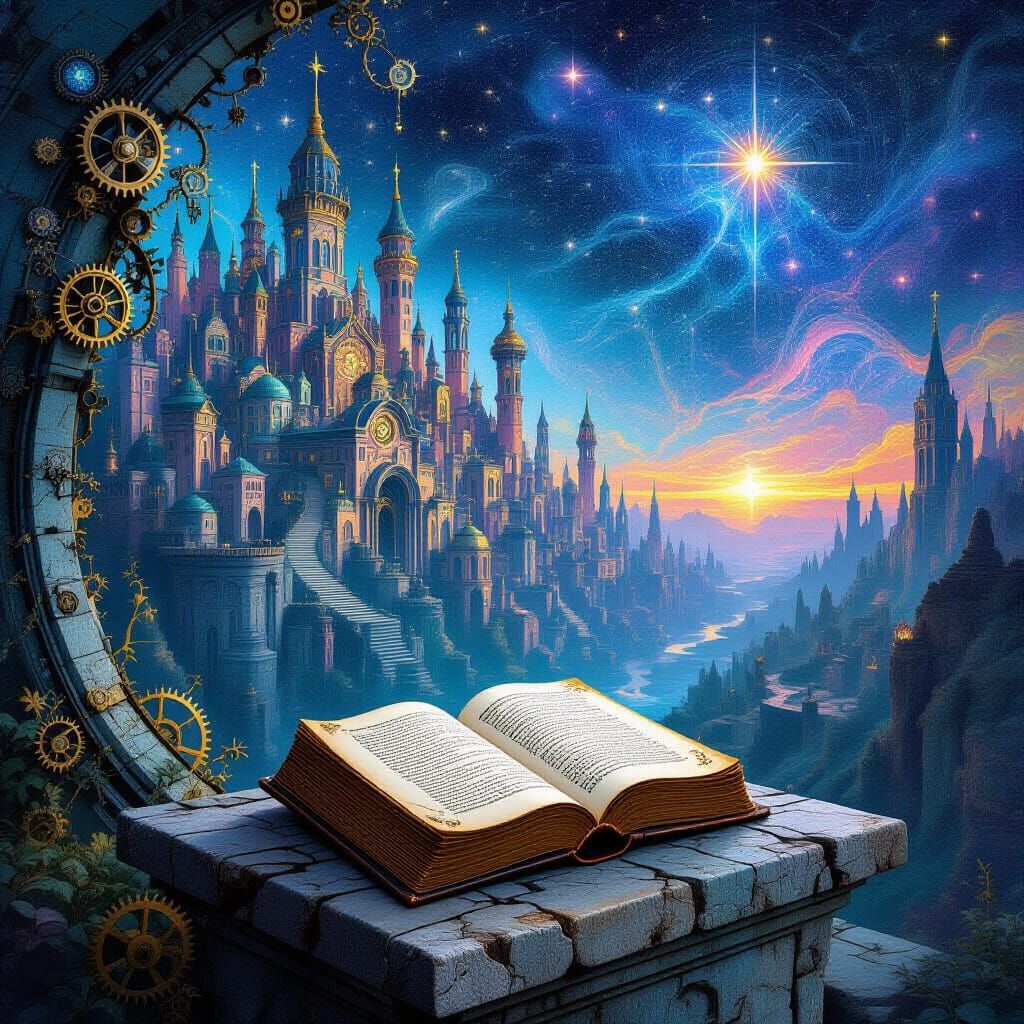 A captivating image of an ancient city blending clockwork and biomechanical elements beneath a starry sky. The surreal composition features iridescent colors and pulsing light, with an open book on a stone pedestal.