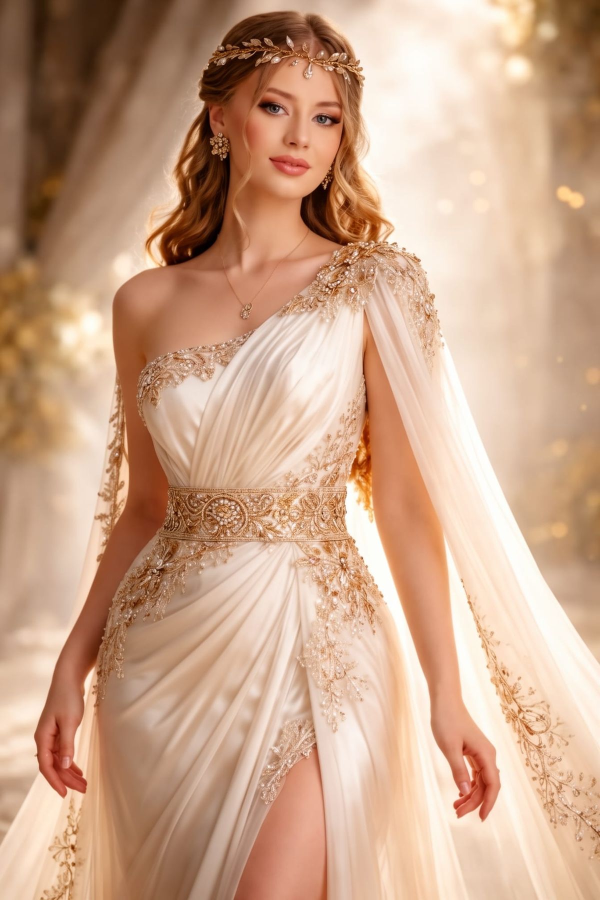 This image showcases an ultra-luxurious ancient Greek couture gown with flowing silk and chiffon layers. It features divine draping, gold laurel motifs, and regal detailing, evoking mythological elegance and timeless feminine beauty.