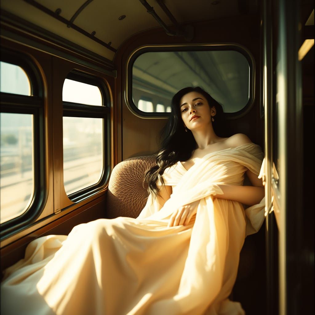 This image shows a woman with long dark hair reclining in a vintage train car. Soft light illuminates her flowing gown, creating a cinematic, retro atmosphere with dramatic lighting.