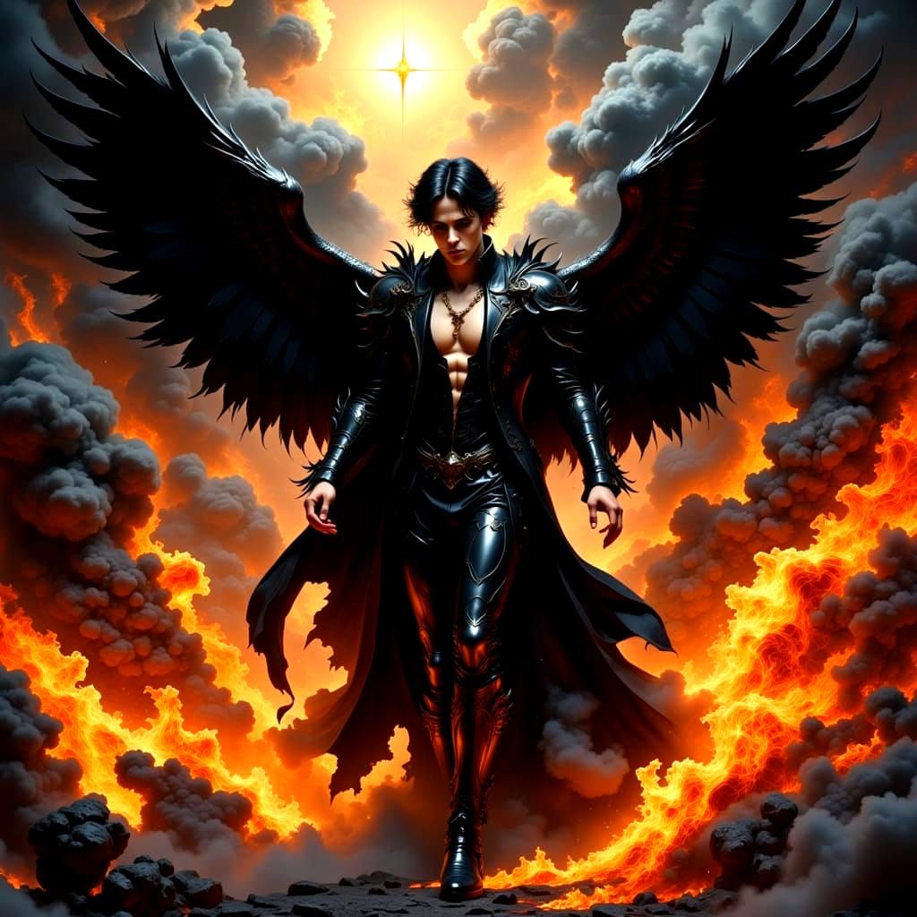 This image shows a hauntingly beautiful fallen angel walking through swirling flames and dark smoke, its black wings outstretched in a dramatic pose.