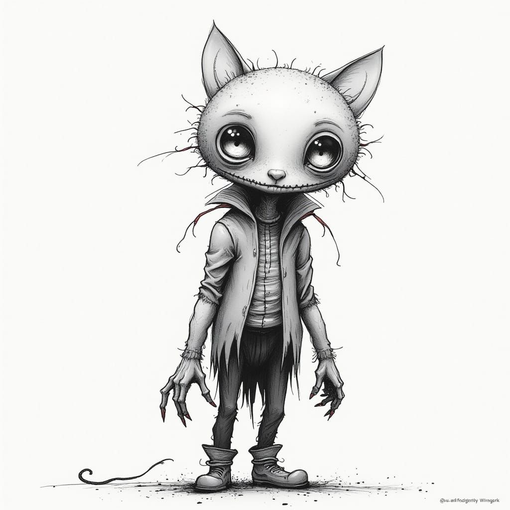 A striking drawing of a figure, stiff and upright, with clenched fists and a tense face, suspended by red threads in a dark, expressive style inspired by the masters of macabre