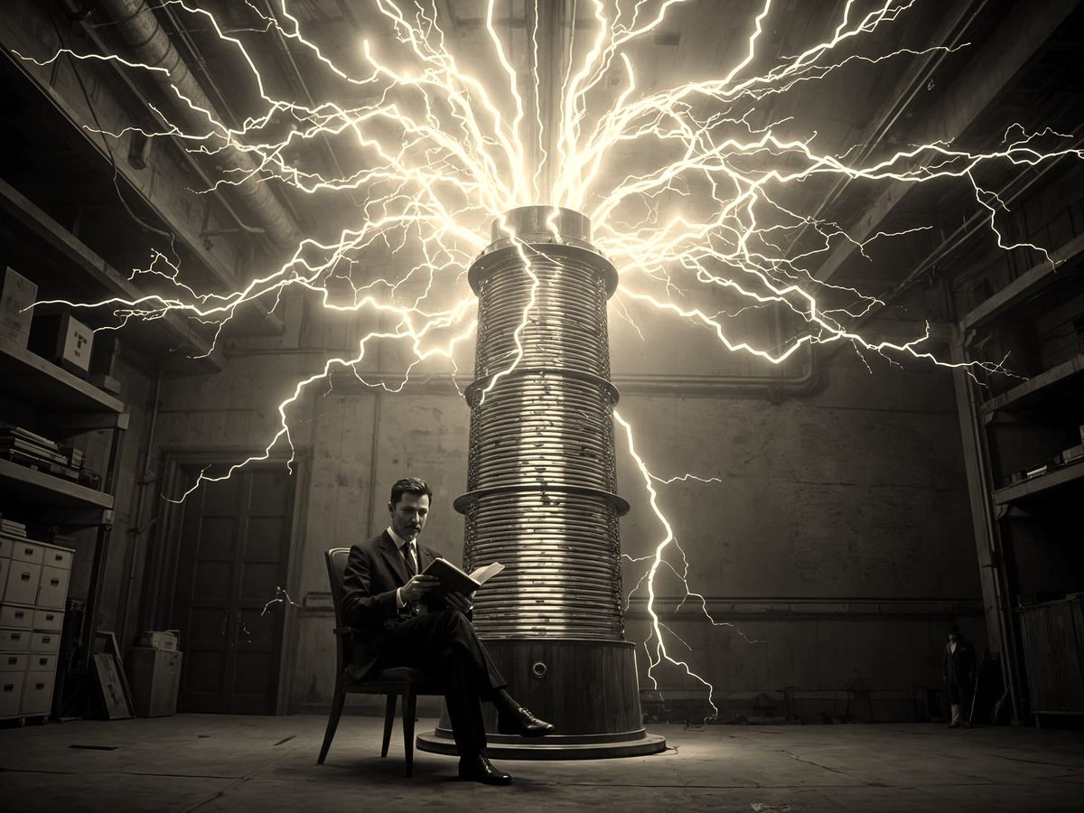 This image depicts a serene Nikola Tesla sitting in a darkened industrial space surrounded by a towering Tesla coil, its electrifying arcs casting an eerie glow, reminiscent of the atmospheric style of Syd Mead and J. M. W. Turner's dynamic lightning