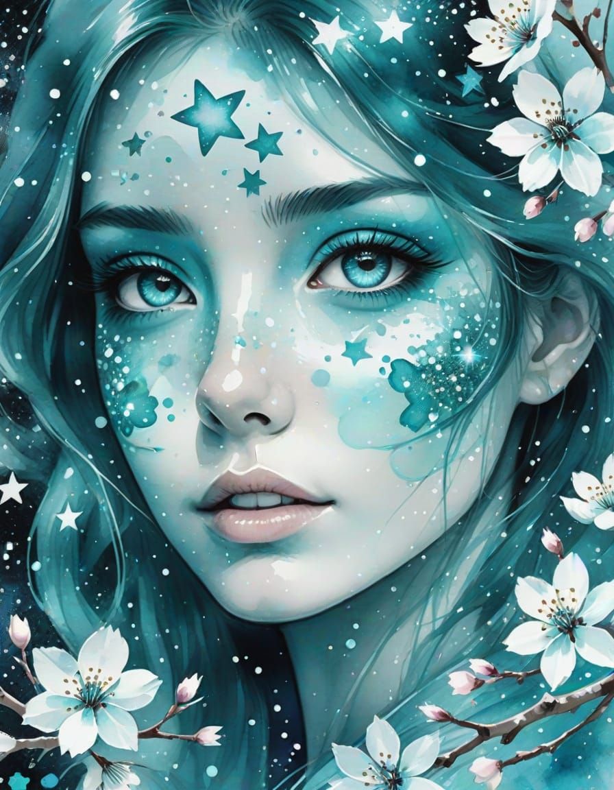 This image shows sparkling aquamarine eyes amidst turquoise stars and cherry blossoms. The artwork features a watercolor splash effect and monochromatic color scheme.