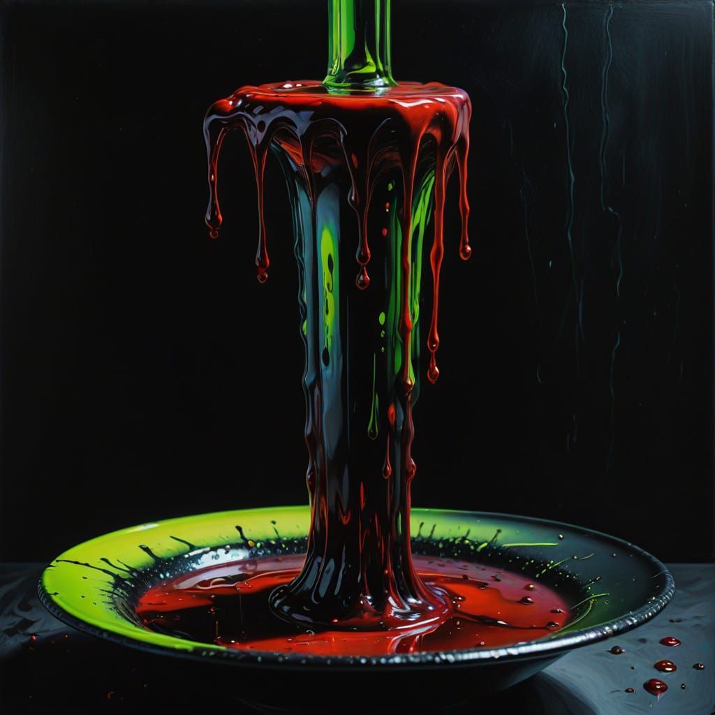 A surreal close-up of a green pole draped with a veil, sitting in a bowl of blood and stardust. This captivating image features melting forms and vibrant colors in a surrealist style.
