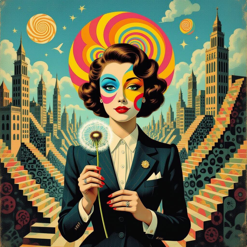 This image depicts a vintage newspaper woman with a face of abstract, swirling colors. She stands in a gravity-defying, Escher-like city with impossible perspectives and dreamlike atmosphere.
