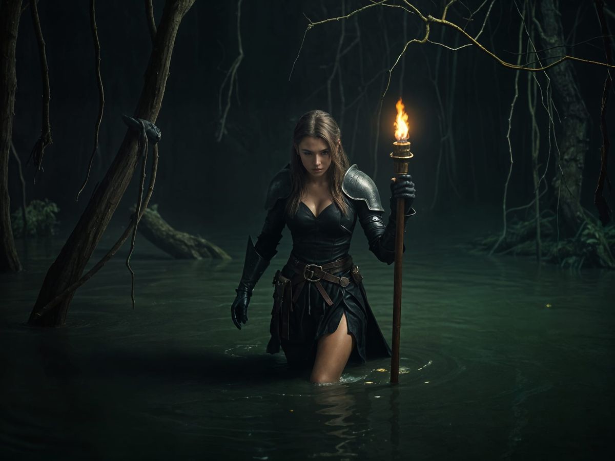 Photorealistic close up: A thin beautiful woman in black leather armor with a torch wades through chest-deep murky swamp water at night using a torch to guide her way. Creepy trees and vines, high contrast, deep shadows, ripples in the water, thick undergrowth.