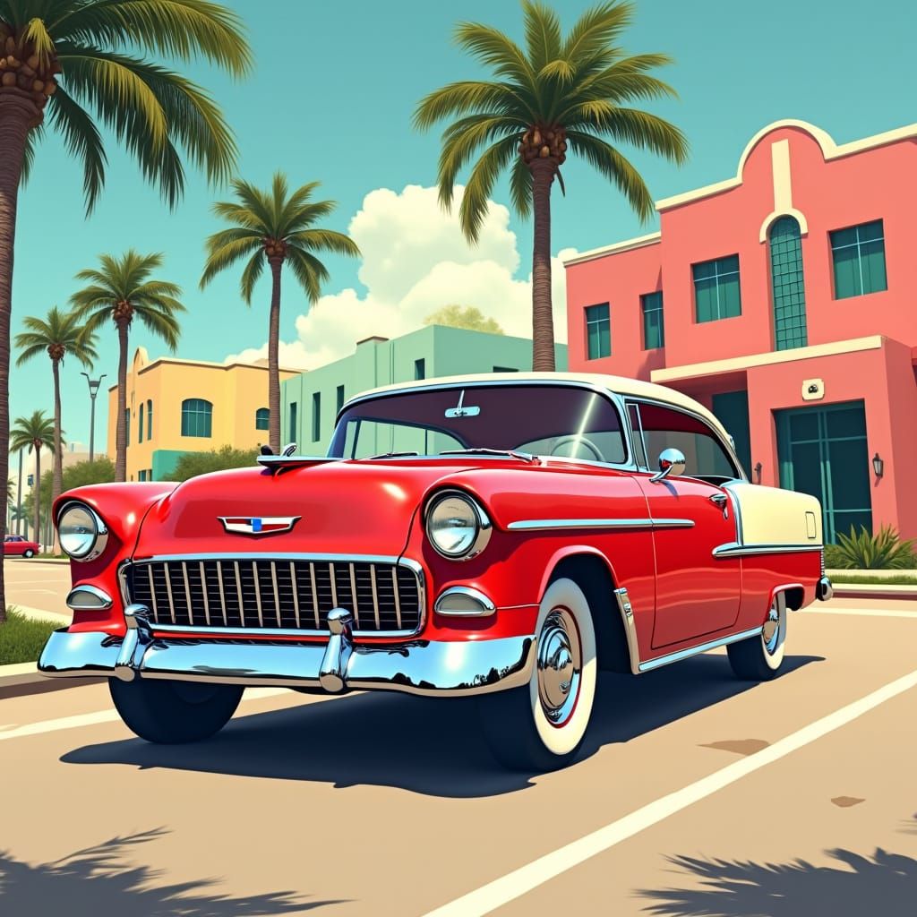 This image captures a cherry-red 1955 Chevrolet Bel Air gliding smoothly down a Miami street, surrounded by swaying palm trees and pastel-hued art deco buildings, with a bold, triadic color palette and meticulous geometric composition
