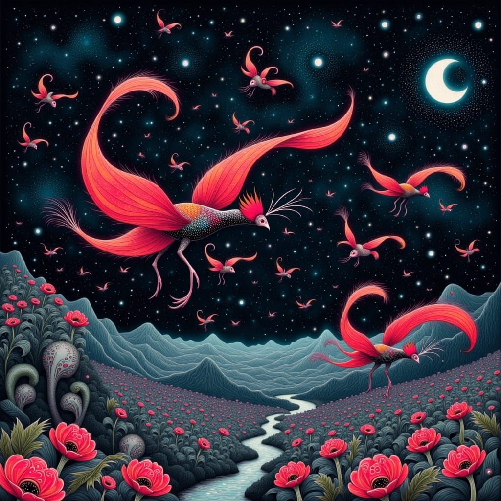 This image shows red streaks resembling pheasant tails across a night sky over ancient Japan. It evokes dreamy landscapes with vibrant colors and whimsical touches, reminiscent of surrealist art.