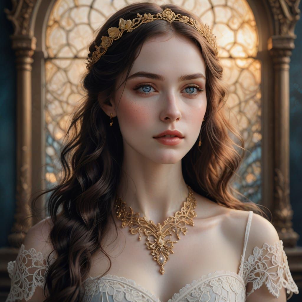 This captivating portrait features a young woman with pale skin, dark hair, and blue eyes, set against a soft, ethereal background. Delicate lace and gold details adorn her elegant corset, while her serene expression and parted lips evoke a sense of timeless beauty and romance.