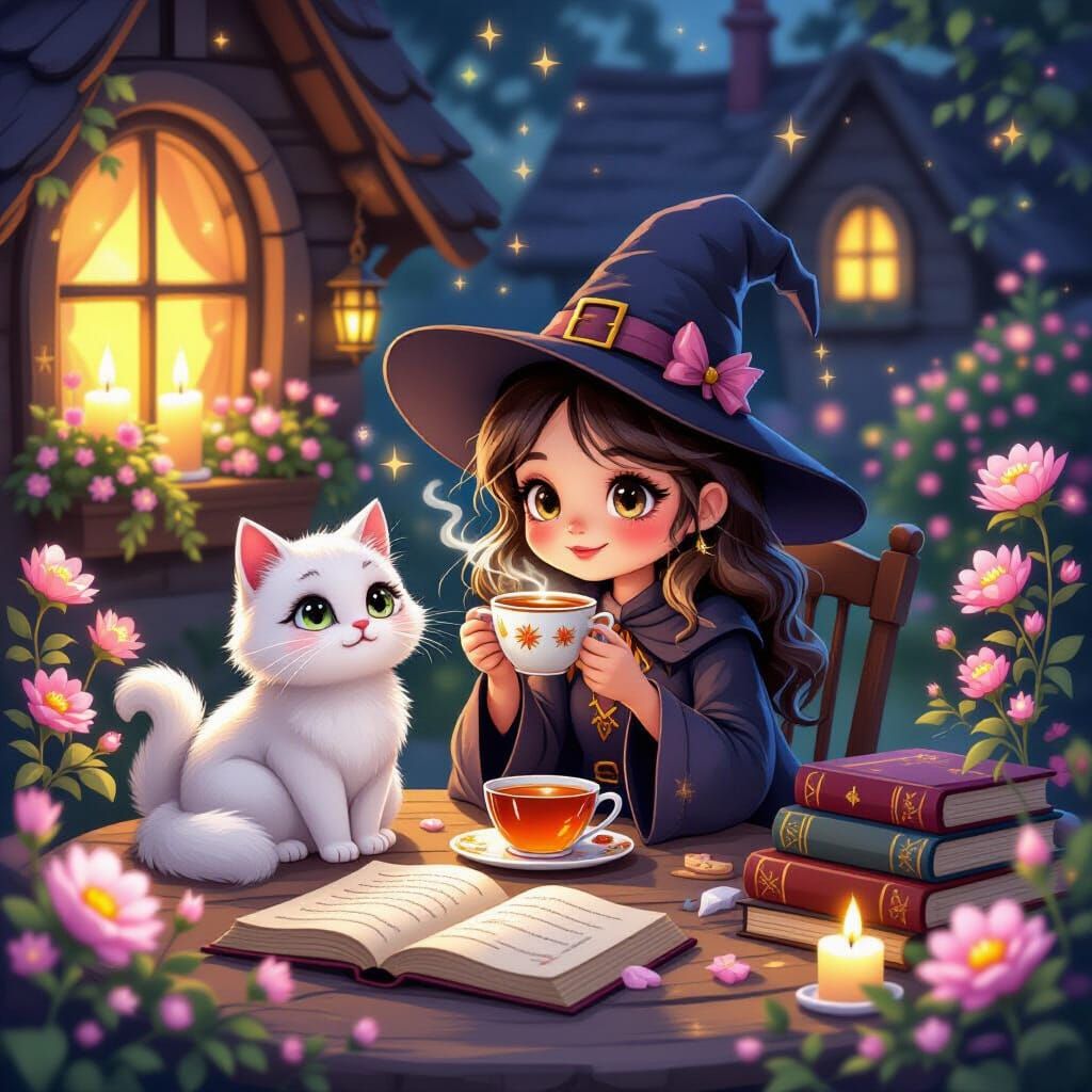 This image depicts a charming witch sharing tea with her feline companion in a cozy cottage filled with glowing flora and ancient books. The scene is bathed in soft, warm light.