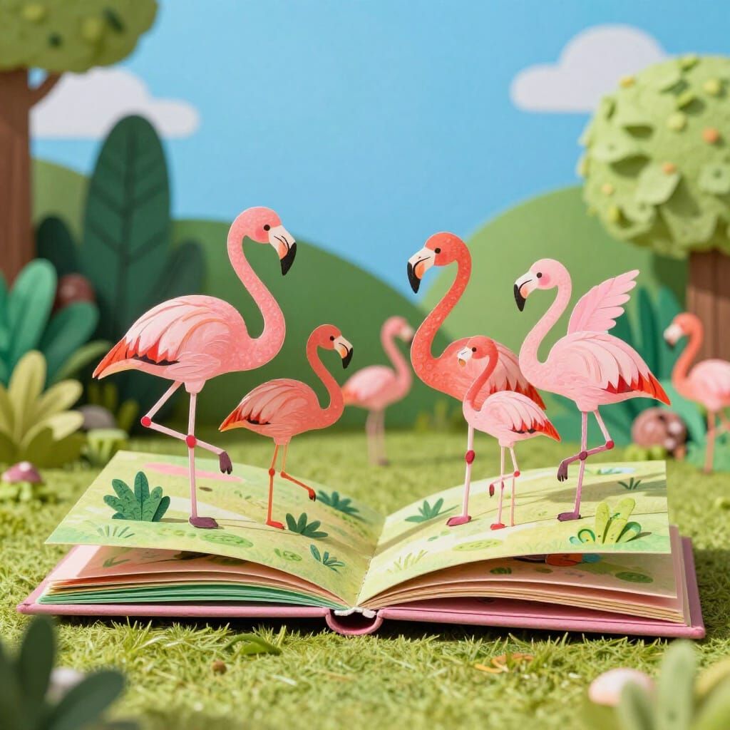 Easily make your own popup book zoo images, featuring happy flamingos and more. Free and simple AI image generation.