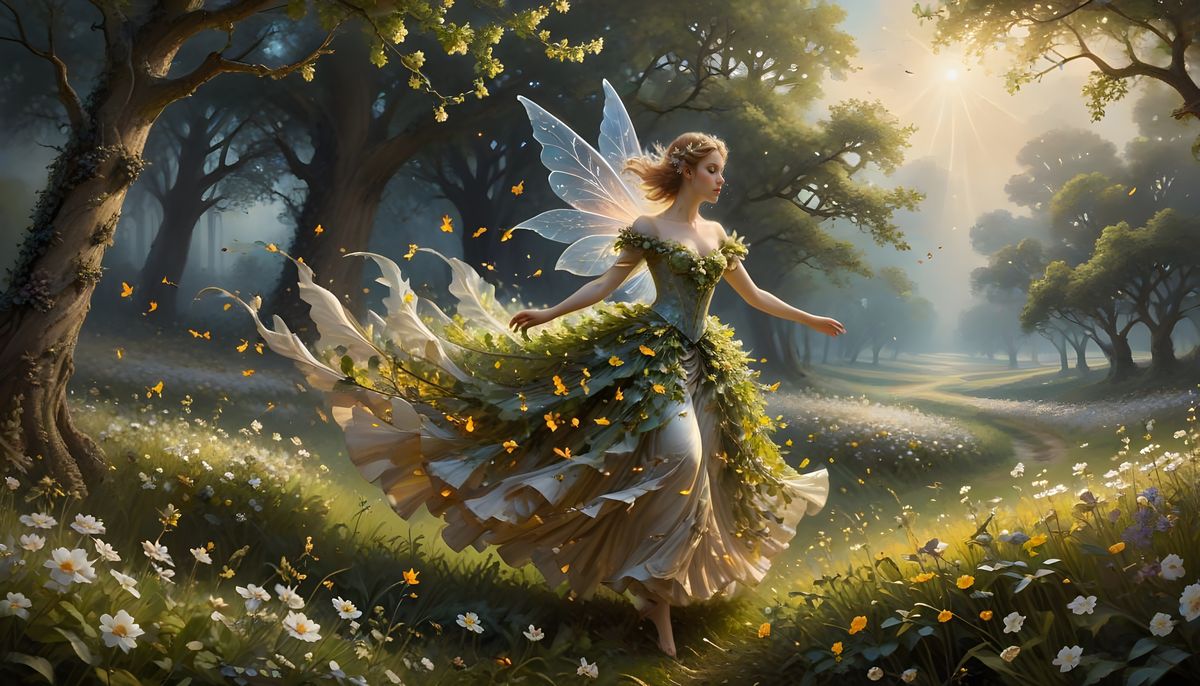 This elaborate oil painting captures an ethereal fairy with a dress of oak leaves, soaring through a field of blooming flowers in a radiant, mysterious style.