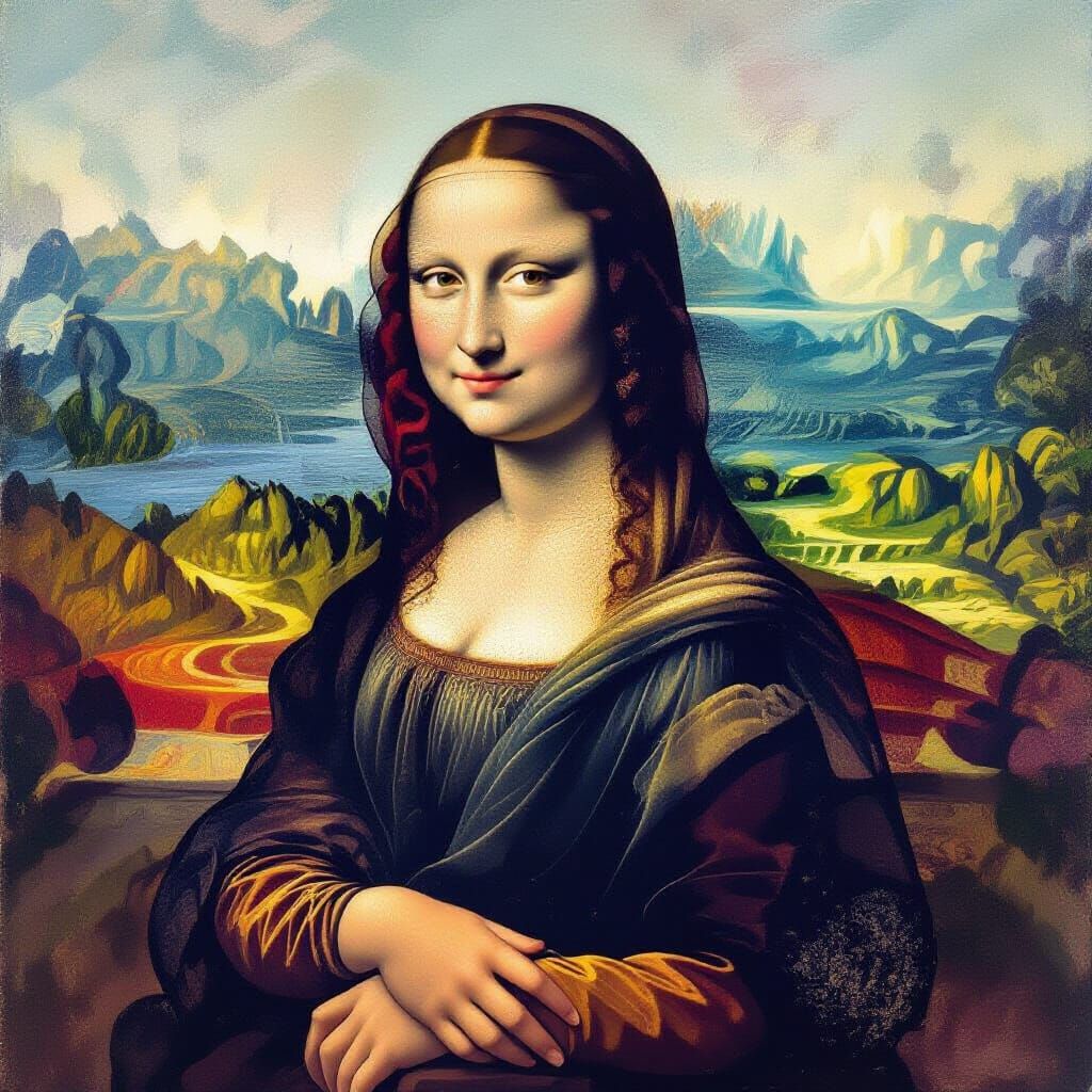 A serene, ethereal interpretation of the Mona Lisa, painted with soft brushstrokes and a pastel palette. This impressionist artwork features dappled light and a peaceful garden atmosphere, capturing the essence of Claude Monet's style.