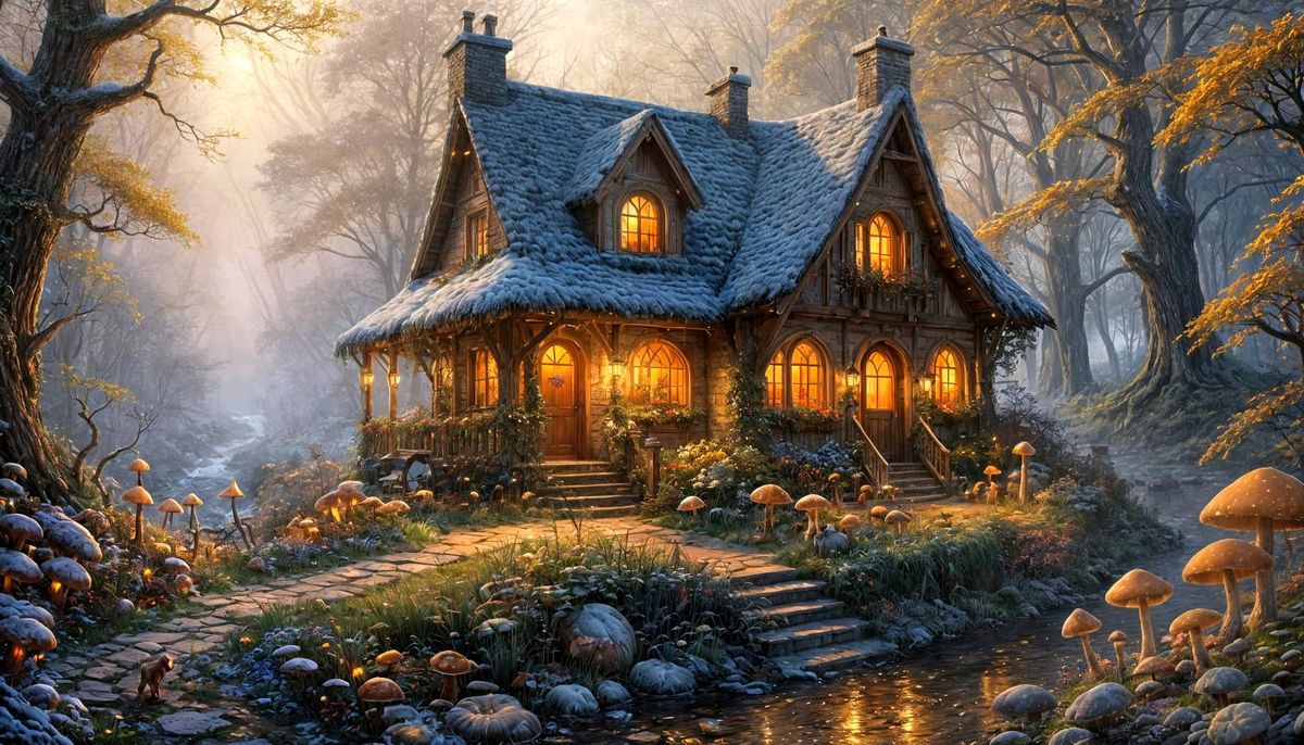 This digital artwork depicts a miniature witch's cottage inside a snow globe, surrounded by giant autumnal mushrooms and golden leaves. Features a warm, magical glow and intricate fantasy illustration details.