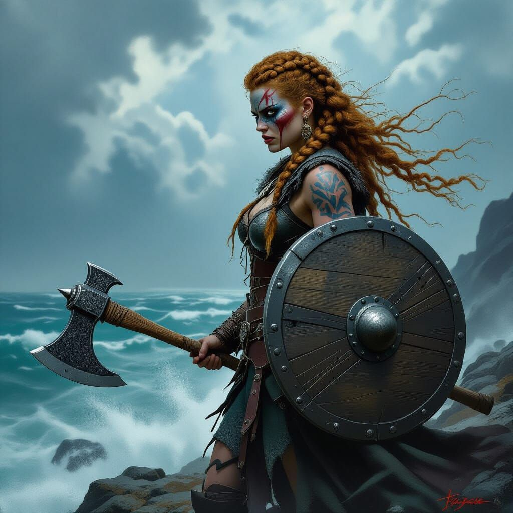 A dramatic image of a Viking warrior woman with braided hair and face paint, standing on rocks above a stormy ocean. The art is reminiscent of fantasy paintings, with cinematic lighting and a gritty, realistic feel.