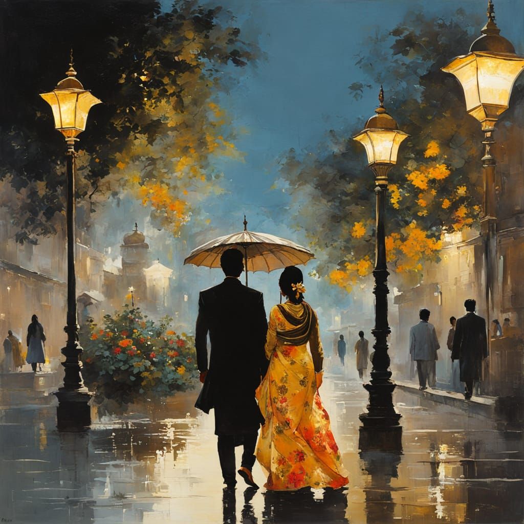 This image depicts a romantic Indian couple in Lucknow's streets, surrounded by a garden, flowers, and illuminated by streetlights under a beautiful sky. Rendered with acrylics on linen and Japanese paper, with gold leaf accents.