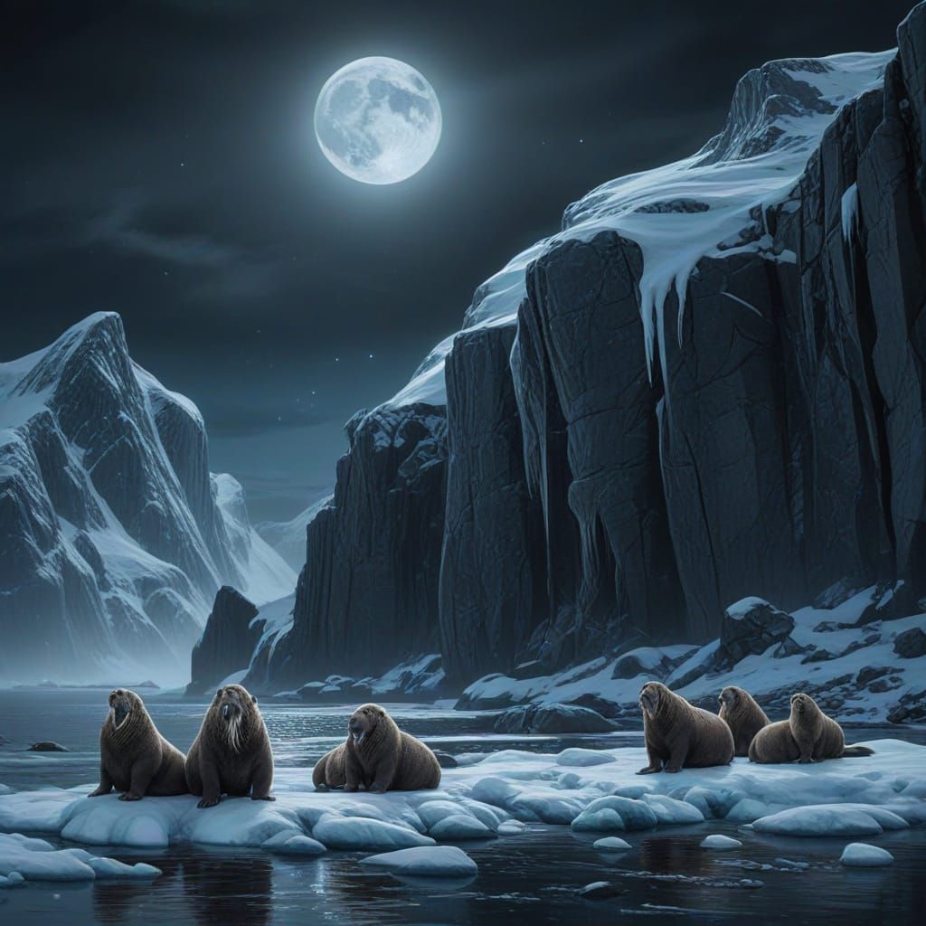 This detailed wildlife illustration shows walruses basking on icy cliffs under silver moonlight. The arctic landscape painting features ethereal bioluminescent lighting and a deep blue and silver palette, creating a majestic and cold ambiance.