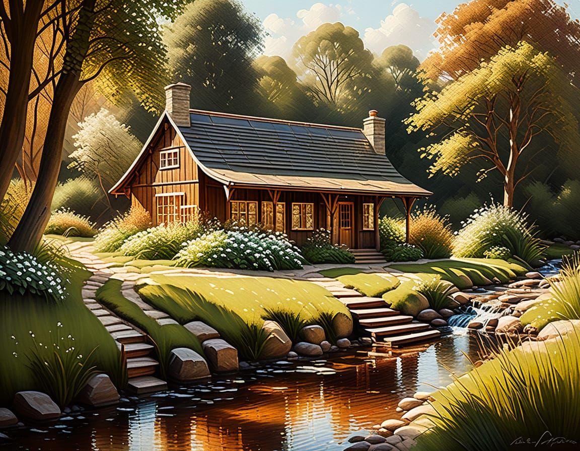 This image shows a cozy wooden cottage next to a creek, illuminated by dappled sunlight. It is rendered in a naturalistic oil painting style with rich textures and warm, earthy tones.