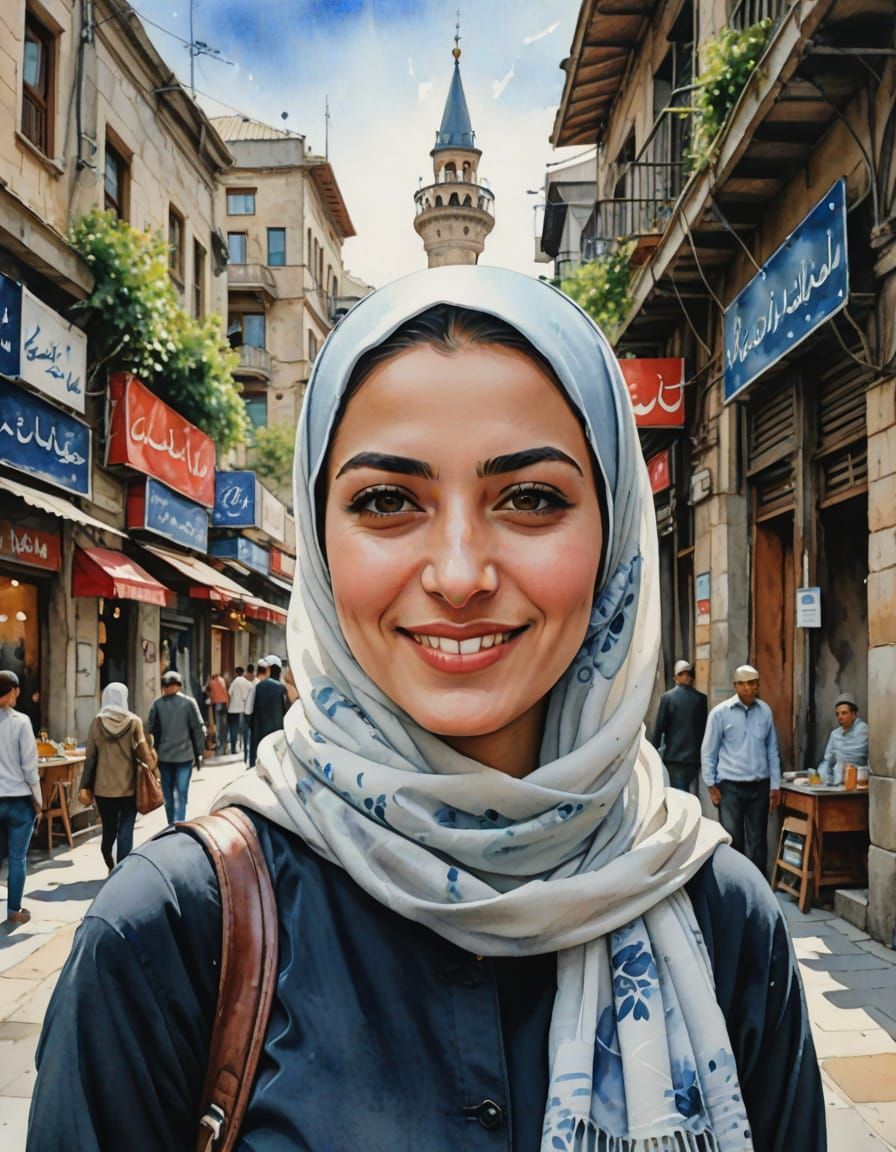 This image is a delicate watercolor portrait of a young Turkish woman in a hijab, captured in the vibrant city of Istanbul. The soft colors and gentle smile evoke a sense of serenity and cultural beauty.
