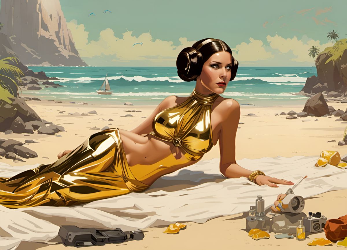 This image shows Princess Leia in a gold bikini relaxing on a beach. The artwork is highly detailed with a polychromatic color scheme, reminiscent of splash art.
