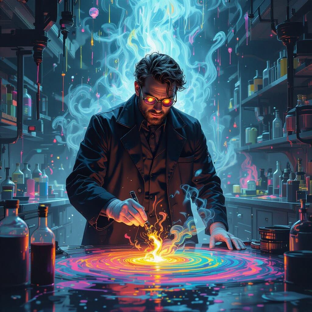 A villainous Dr. Chromatic, in a black lab coat, schemes amidst swirling iridescent paints to drain the world's color. The image blends fantastical realism with a futuristic neon noir aesthetic.