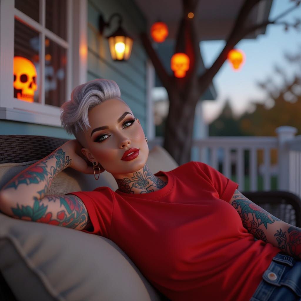 This 3D game cinematic style image shows a tattooed woman with silver hair relaxing on an outdoor sofa, with a Halloween tree and skull lights. High-definition and dynamic lighting.