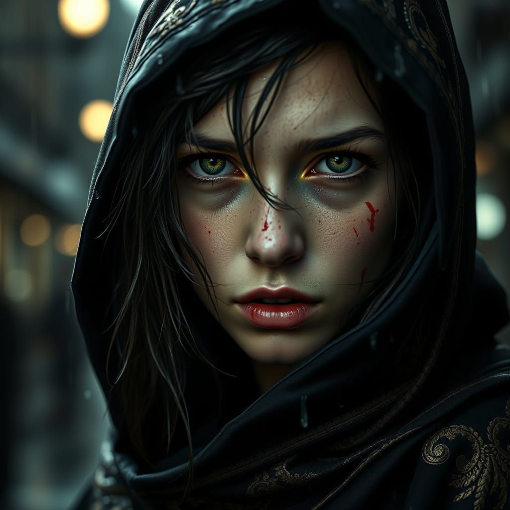 This image is a close-up portrait of a young woman with piercing green eyes, set against a dark, gritty urban backdrop with a sense of moody intensity and foreboding, reminiscent of dark fantasy and gothic fairy tales.