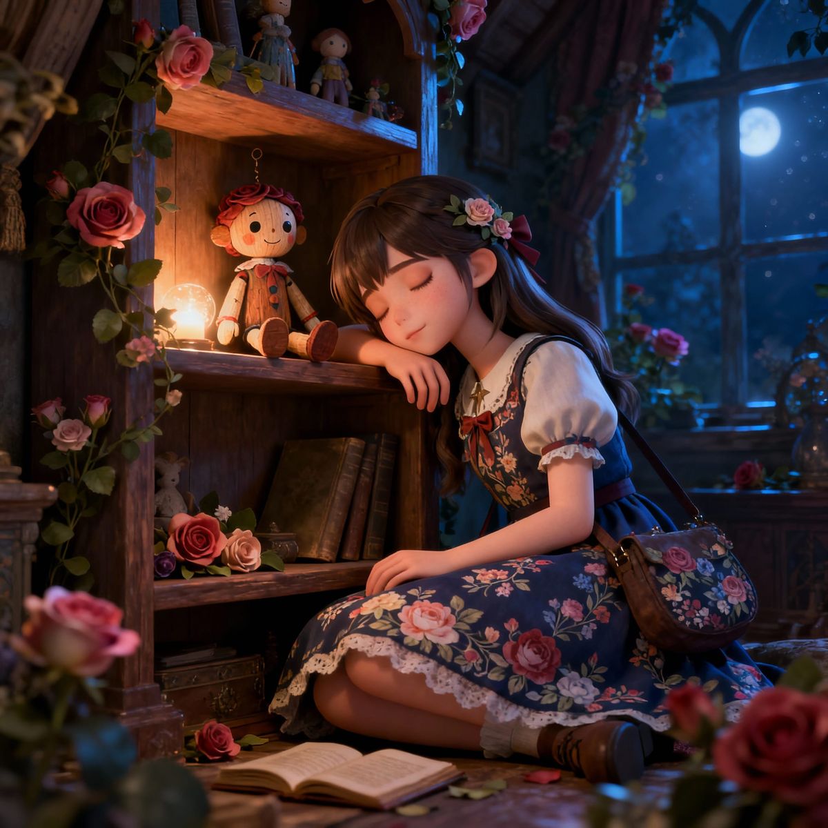 This image depicts a detailed concept art scene of a Rosewood Puppet, adorned with floral patterns, experiencing peaceful togetherness and introspection. It features intricate light and shadow play, rendered in a 3D anime art style.