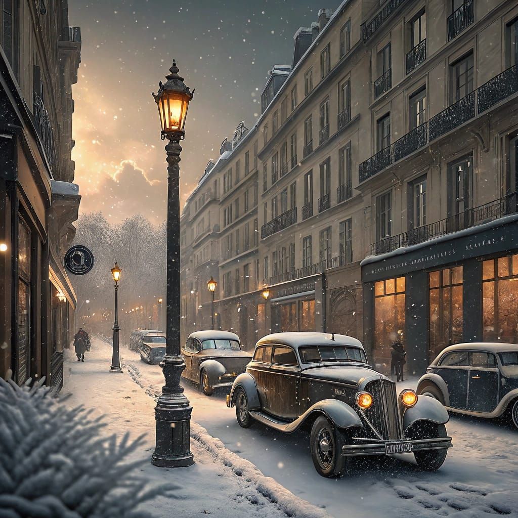 This image shows a snow-covered street scene in 1920s Paris. Vintage cars are parked along the curb, evoking a sense of historical charm in winter.