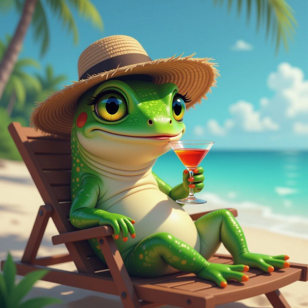 artistic whimsical image, green eyed salamander, large eyes, full lips, straw hat, sipping a martini, sitting on wooden lounge chair, beach and ocean in background