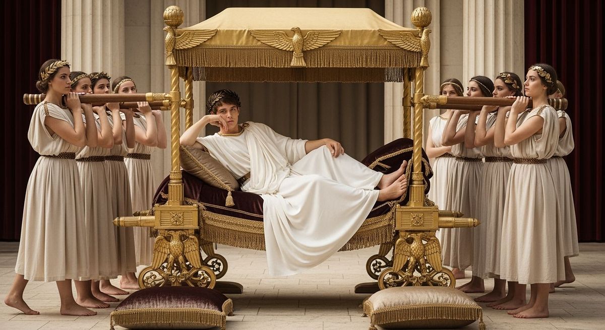 This image shows a Roman Emperor reclining on a golden litter carried by servants. Shot with a shallow depth of field and soft lighting, the image evokes high-definition historical photography.