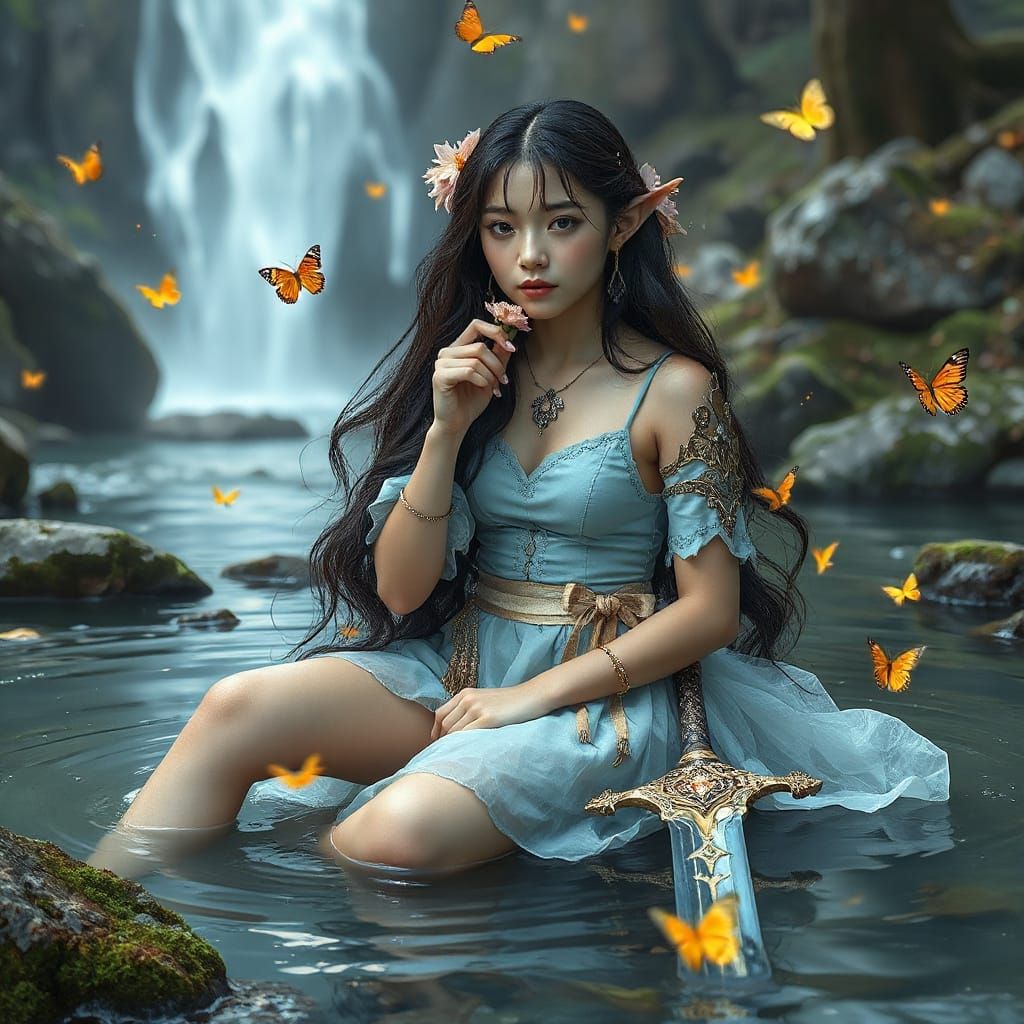 This image shows a serene elf maiden surrounded by nature's beauty, seated in a flowing stream with delicate flowers in her hair, and a magical sword by her side, in a hyperrealistic, cinematic art style with intricate details and ethereal lighting.