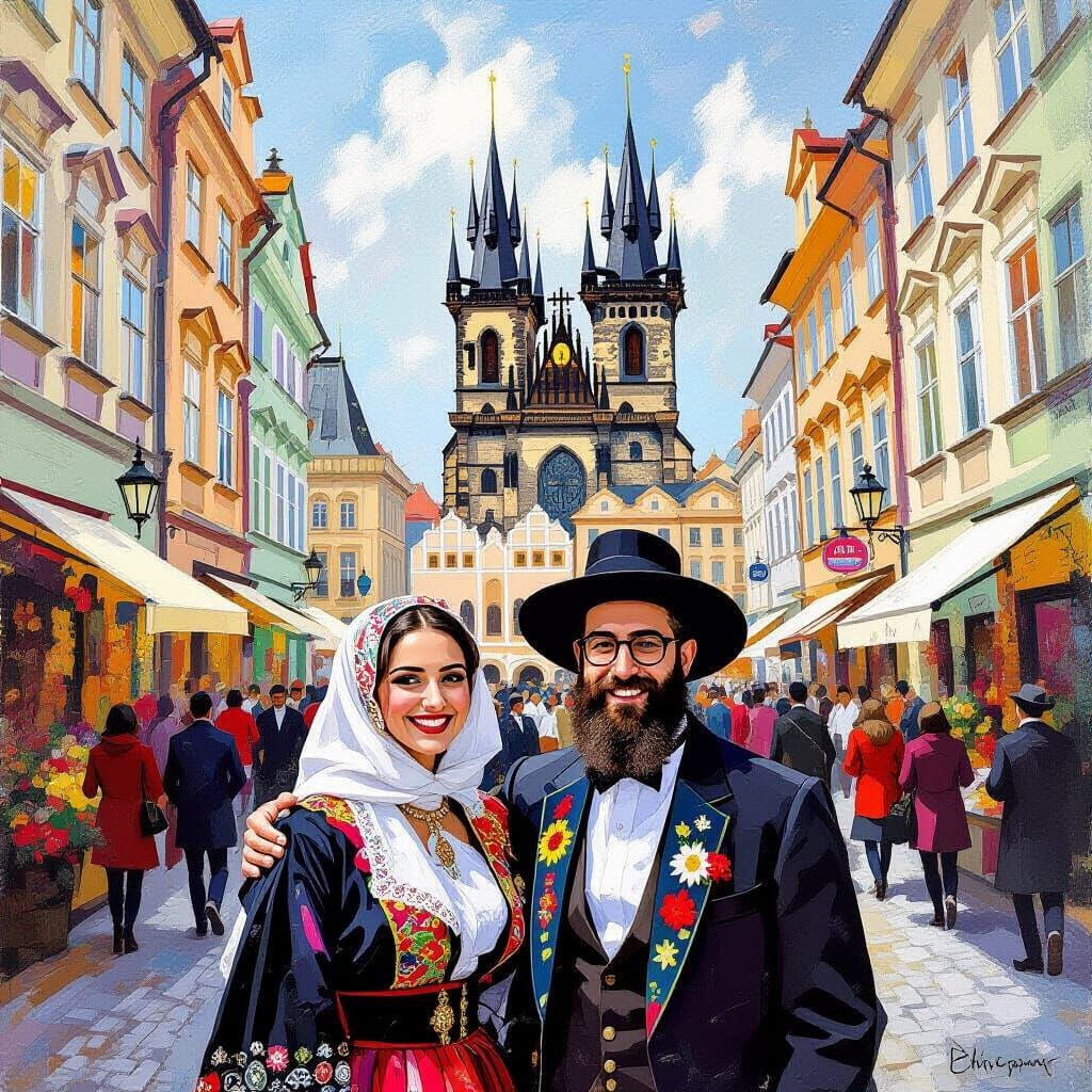 This image shows Israelis in traditional clothing being welcomed to Prague's Jewish Quarter near the Spanish Synagogue. The modern scene features Gothic spires and bustling streets in a vibrant, colorful style.