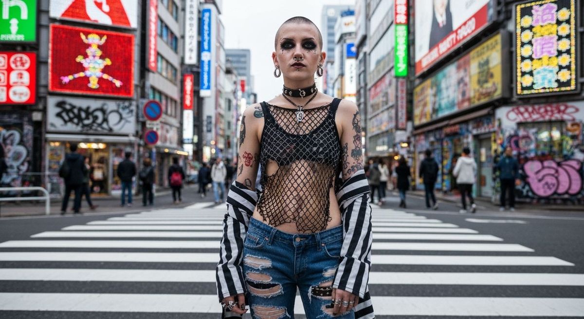 This image shows a punk gyaru with shaved head and piercings, wearing ripped jeans and a fishnet top. Graffiti walls and neon signs create a vibrant background in a Takashi Murakami-inspired aesthetic.