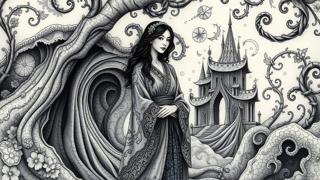 This intricate image shows a woman standing in a fantastical, layered environment with swirling patterns, reminiscent of Escher's impossible geometry and Miyazaki's dreamlike worlds, rendered in a hyperdetailed, 8K ink wash style with a mesmerizing Droste effect.