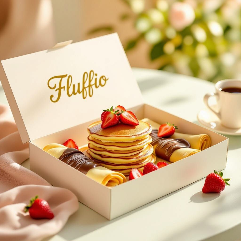 This image shows a dessert box filled with pancakes, strawberries, and crepes on a pastel table. The shot has a dreamy aesthetic with a soft, blurred background and a light, warm color palette.