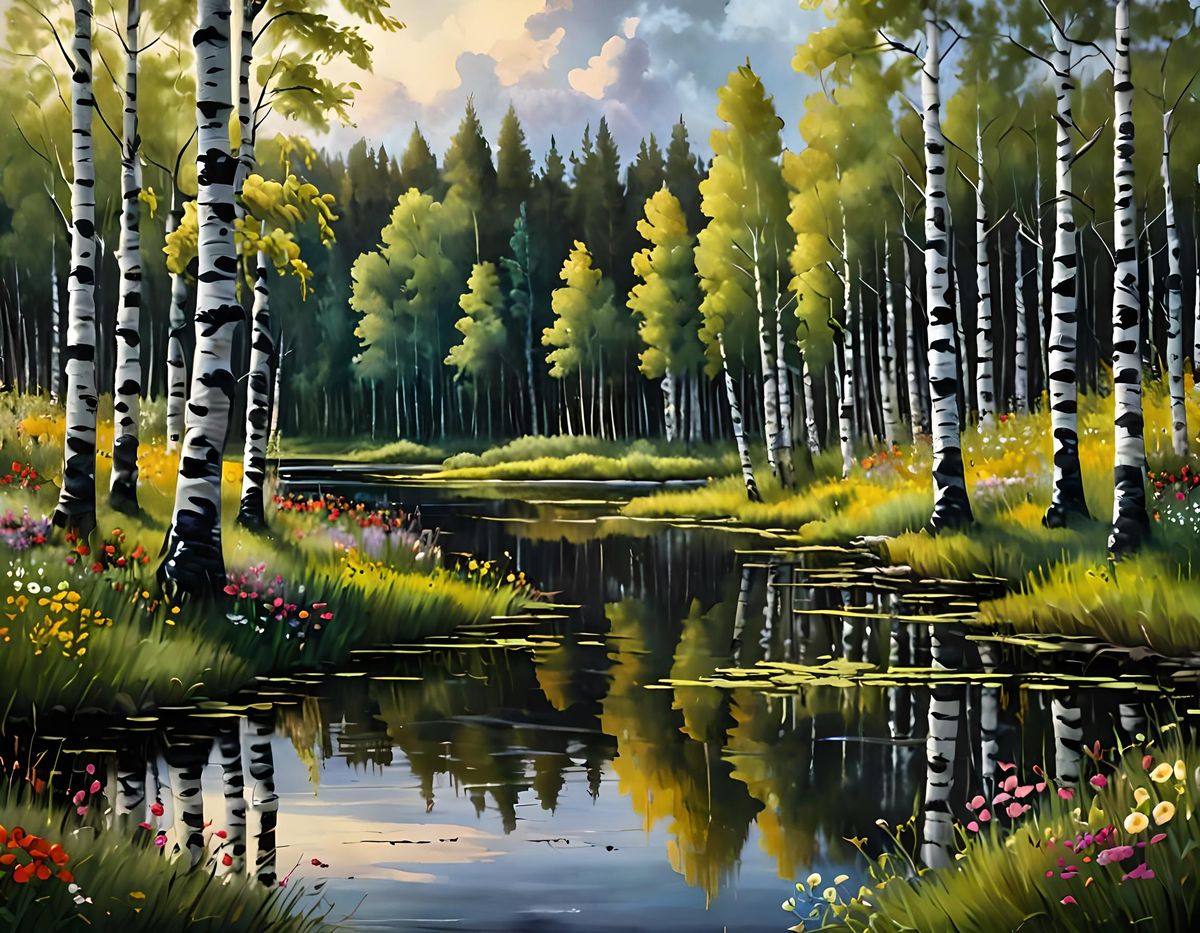 This image shows a tranquil lake surrounded by birch trees and wildflowers. The oil painting uses dark, moody tones to create a serene landscape scene.