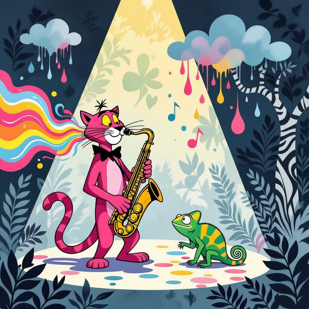 This image shows the Pink Panther playing a saxophone with colorful waves emanating from it. A chameleon attempts to match invisible objects in an Art Deco jungle, all rendered with minimalist chic and whimsical elements.