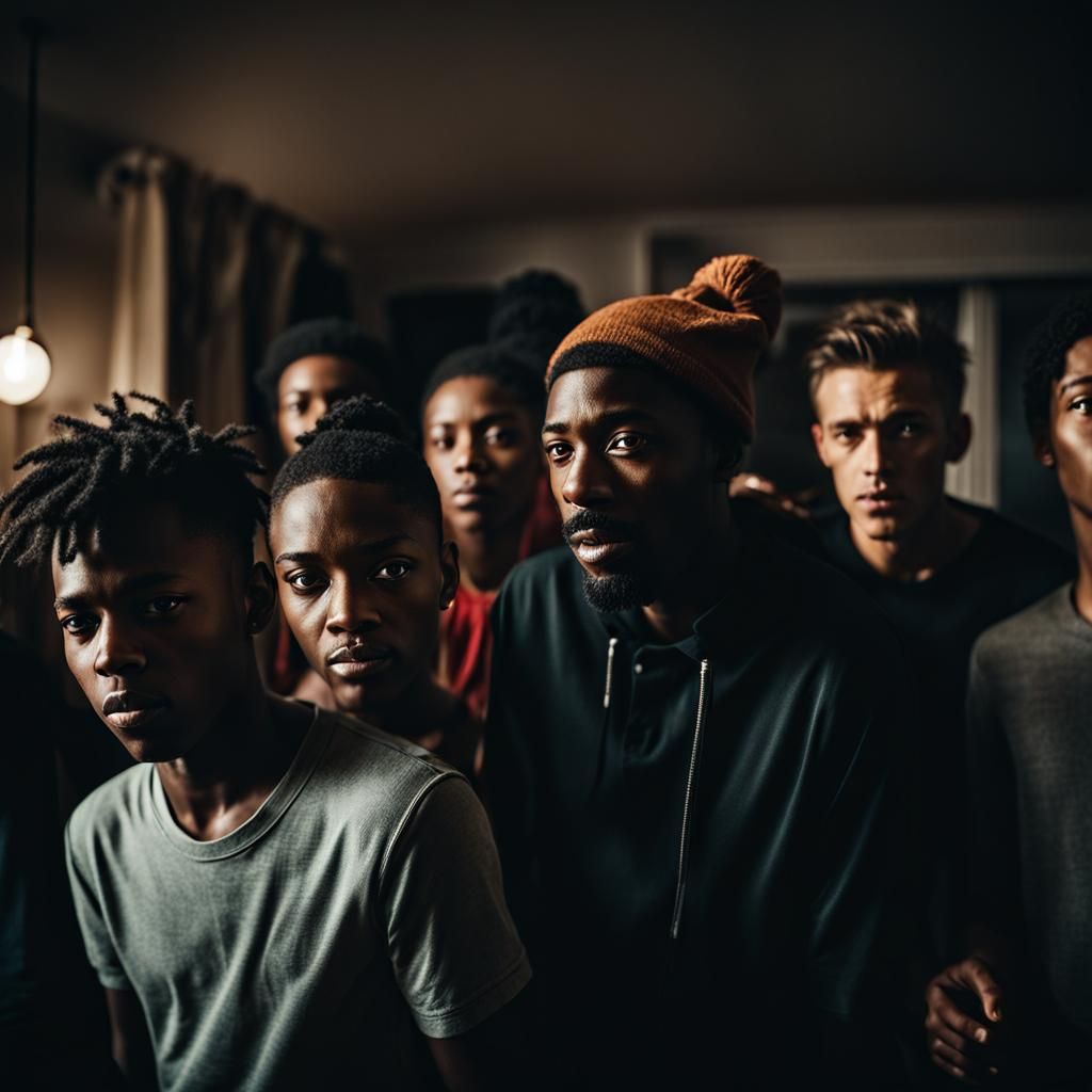 This image shows young people dancing in a living room at night, illuminated by ambient light. The close-up portrait captures the energy of the scene with a realistic aesthetic.