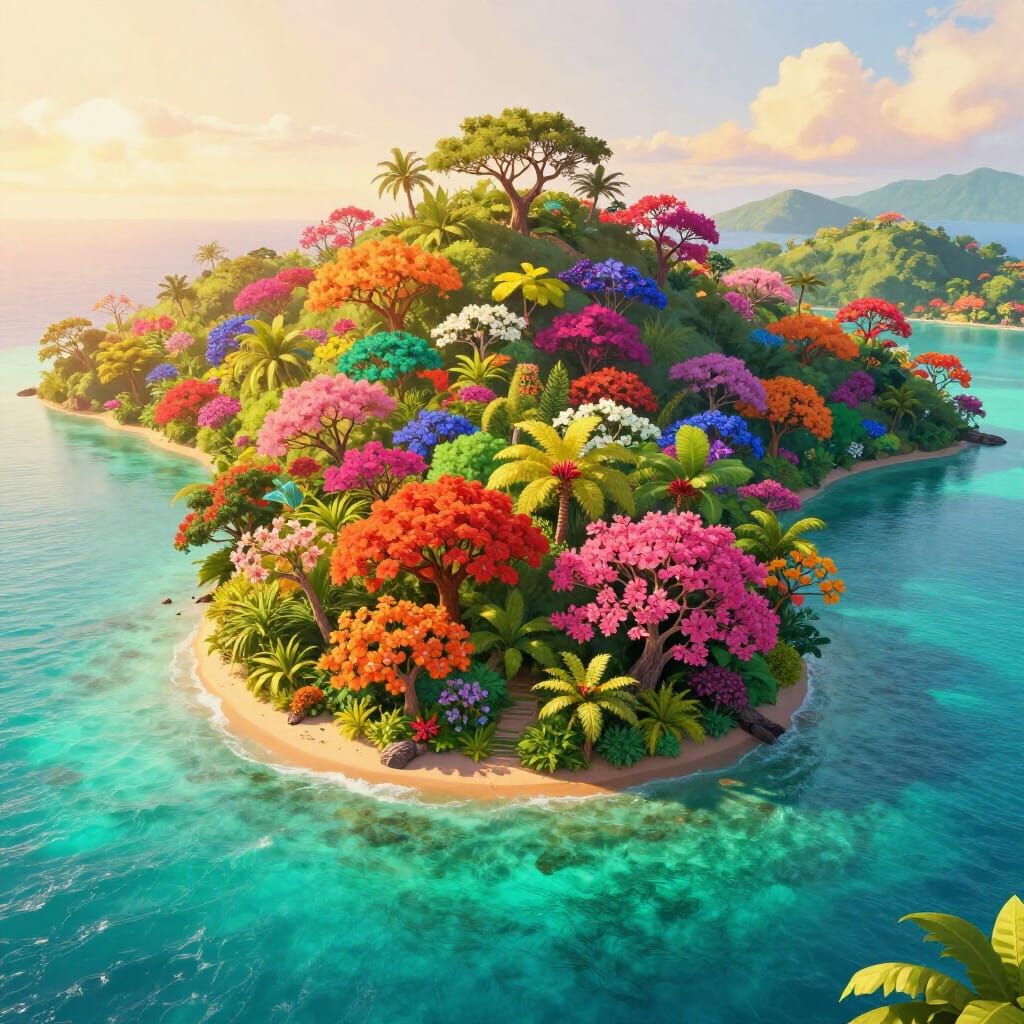 Generate unique island scenes with vibrant trees and flowers. Free and easy AI image creation.
