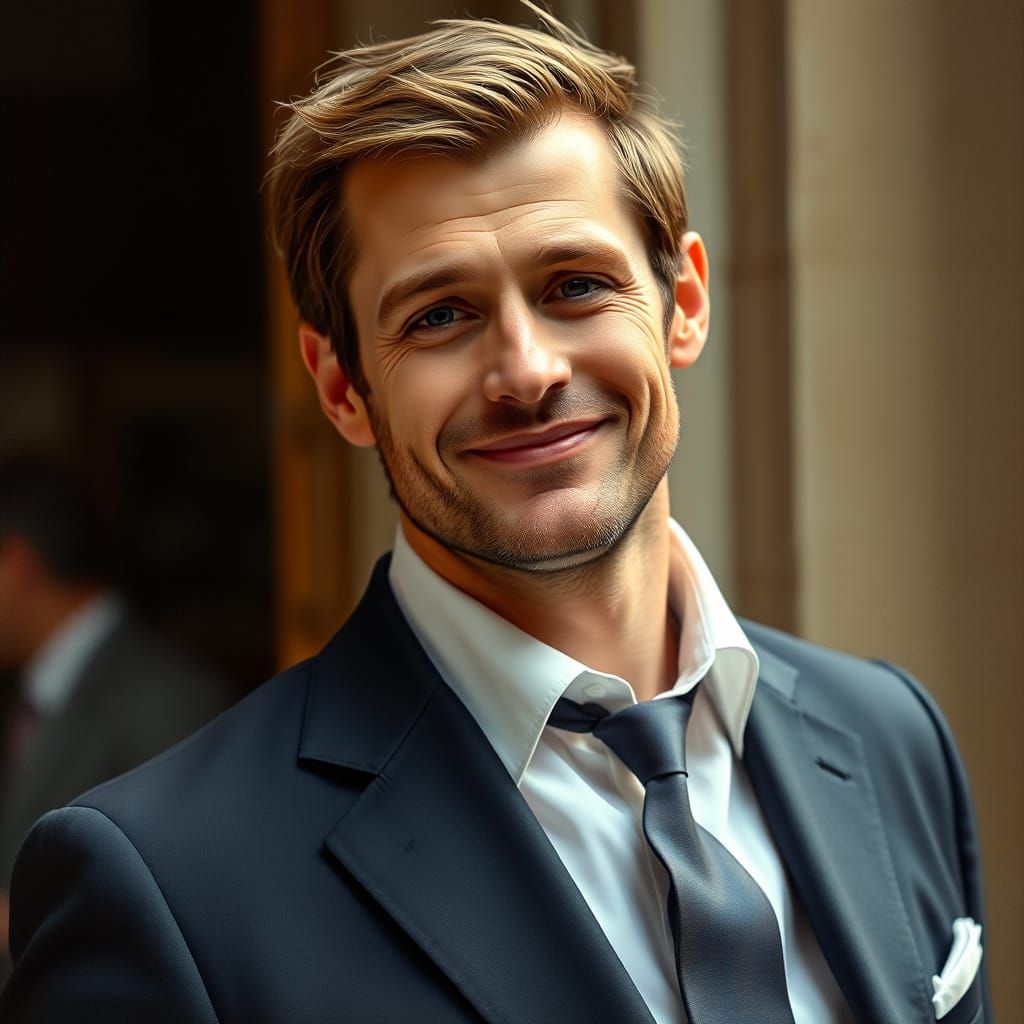 This portrait captures a stylish and confident European man, dressed in a tailored suit, with a warm and inviting smile, reminiscent of 19th-century Impressionist paintings and the fine details of Renaissance portraits.
