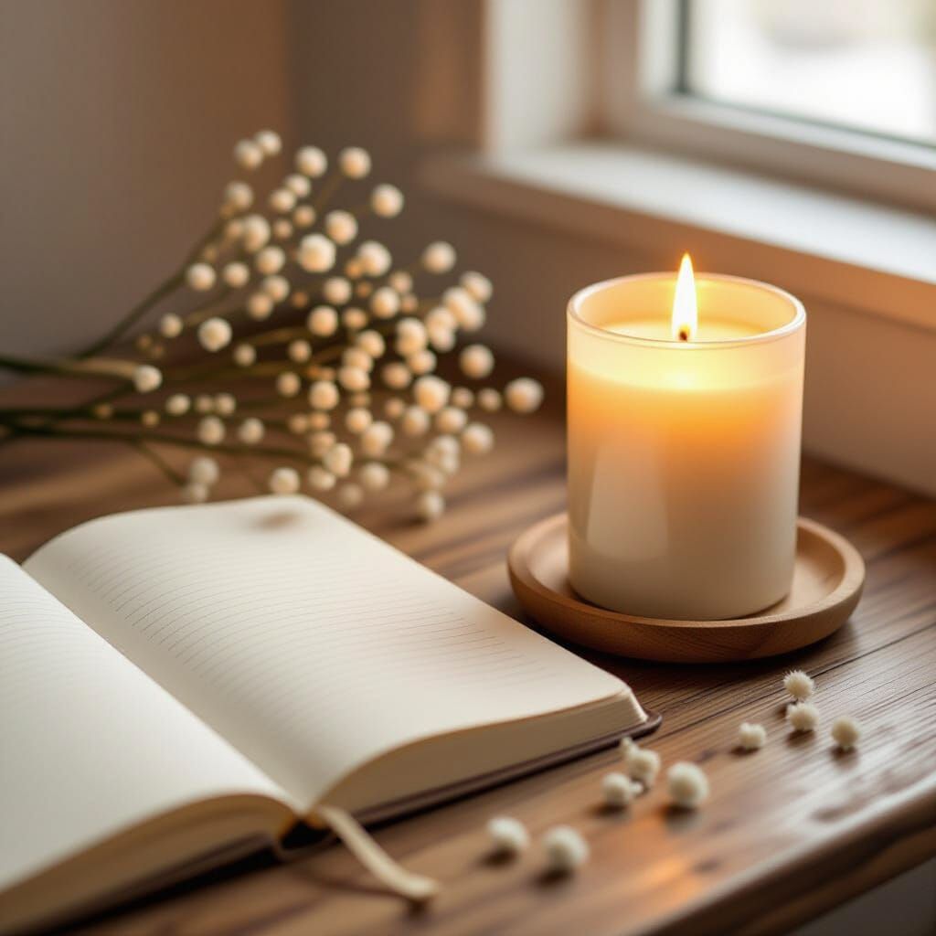 A soft watercolor illustration of a single lit candle on a wooden desk, beside an open notebook and dried flowers. The warm amber glow of the flame brings peace, quiet reflection, and calm moments. Perfect for cozy evenings and soul-soothing vibes. ✨🕯️📖
