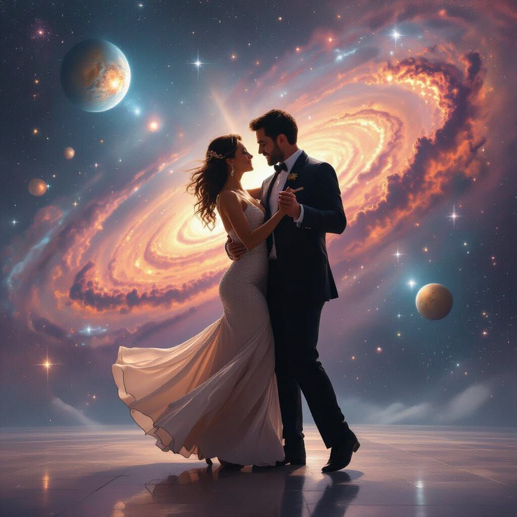 A vivid image shows a couple dancing tango in zero gravity amidst swirling galaxies. Luminous planets and colorful nebulae surround them in this digital artwork, with dramatic lighting and detailed textures.