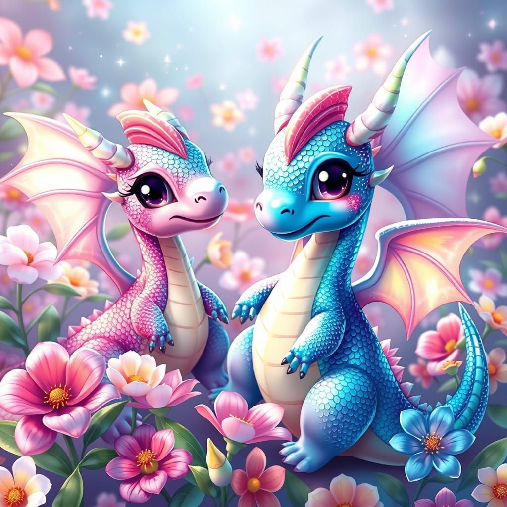 This image features adorable, tri-colored dragons amidst lush, oversized flowers in soft pastel hues, with shimmering scales, iridescent wings, and sparkling eyes, all in a classic shoujo manga style with exaggerated, hyper-realistic details and bright, high-contrast colors.