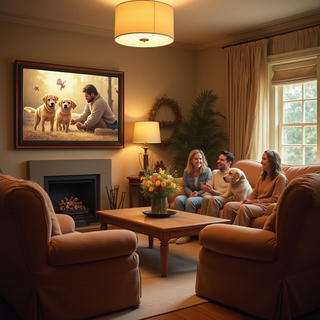 This warm and inviting home parlor is filled with a sense of love and contentment. Soft golden lighting from a elegant ceiling lamp creates a cozy atmosphere, while a beautifully framed picture of a happy family hangs on the wall, surrounded by plush armchairs and a vase of fresh flowers.