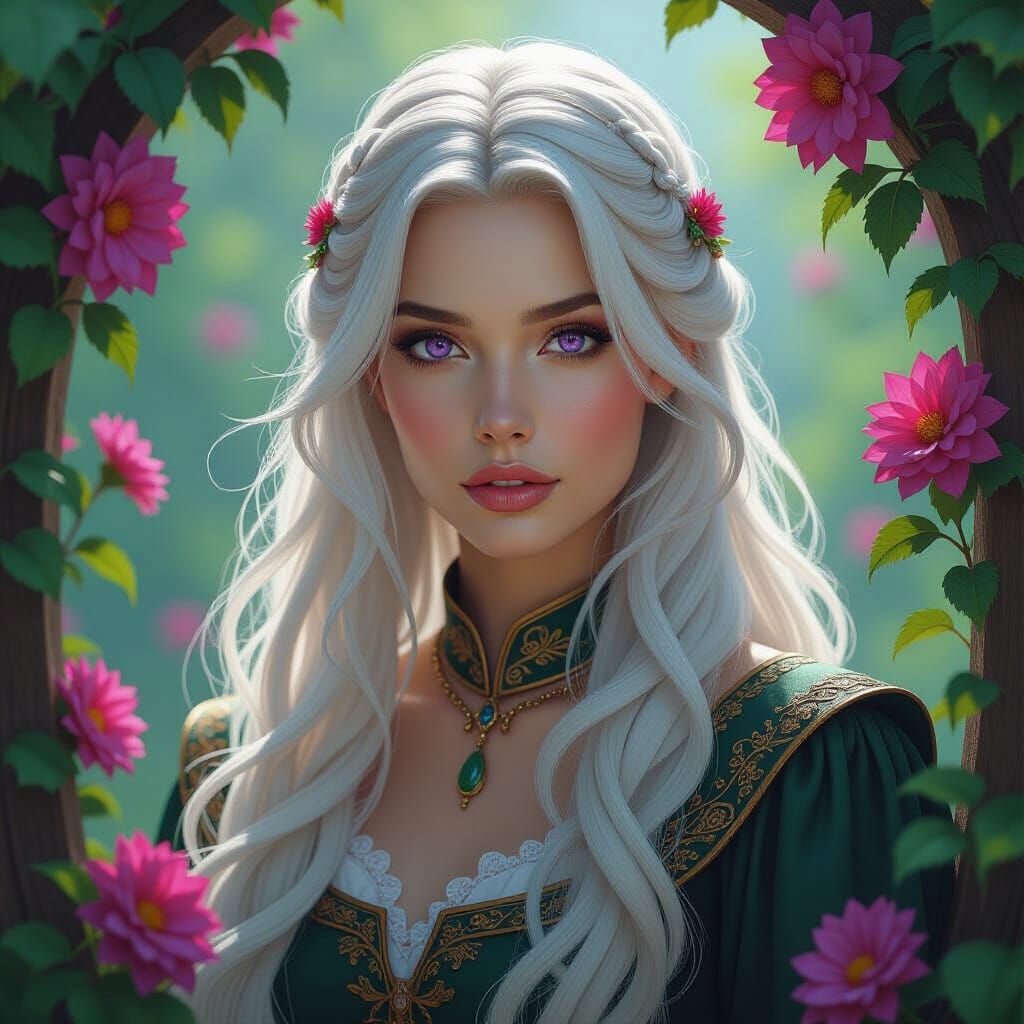 This image shows a medieval lady with white hair and purple eyes amidst flowers. The artwork features rich, deep colors and intricate details reminiscent of fantasy concept art.