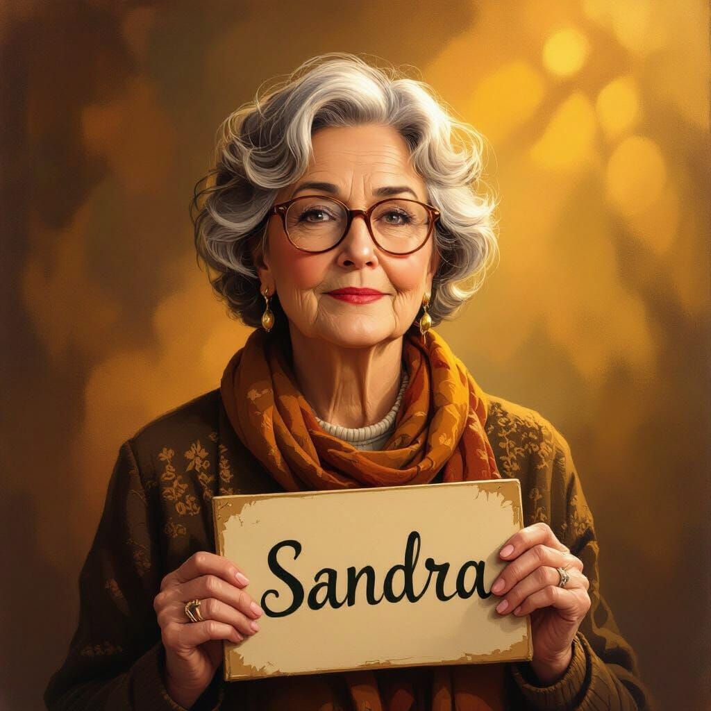 This image shows an older, plump woman with cinnamon skin and wavy brown hair, wearing glasses. She holds a sign that says SANDRA, bathed in warm, golden light. The style is impressionistic oil painting with bold brushstrokes.