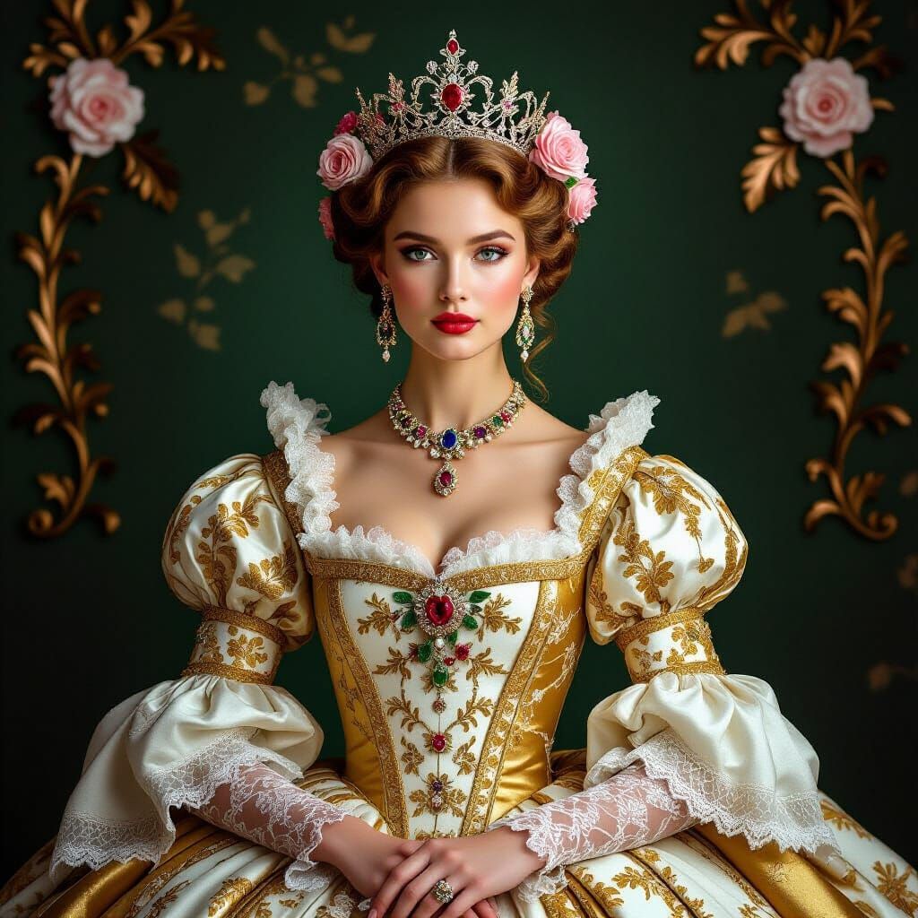 A breathtaking masterpiece that embodies the grace and grandeur of royalty. This royal portrait showcases a princess adorned in a golden baroque gown with intricate lacework and floral embellishments. Her jeweled crown, delicate roses, and regal accessories highlight her timeless beauty, while the emerald backdrop framed with golden florals enhances the majestic aura. Rendered in hyperrealistic 8K detail, this image blends elegance, artistry, and nobility into one stunning vision.