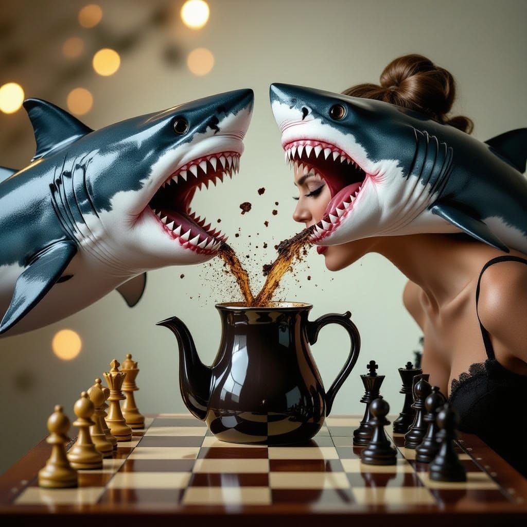 A professional, close-up portrait of a woman in stockings battling a creature of shark skulls on a chessboard, captured with dramatic studio lighting and soft bokeh.