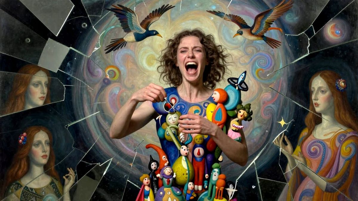 This image depicts a woman screaming as she gathers shattered mirror fragments reflecting deep space. She constructs an abstract sculpture from whimsical figurines, in a dreamlike, mystical style.